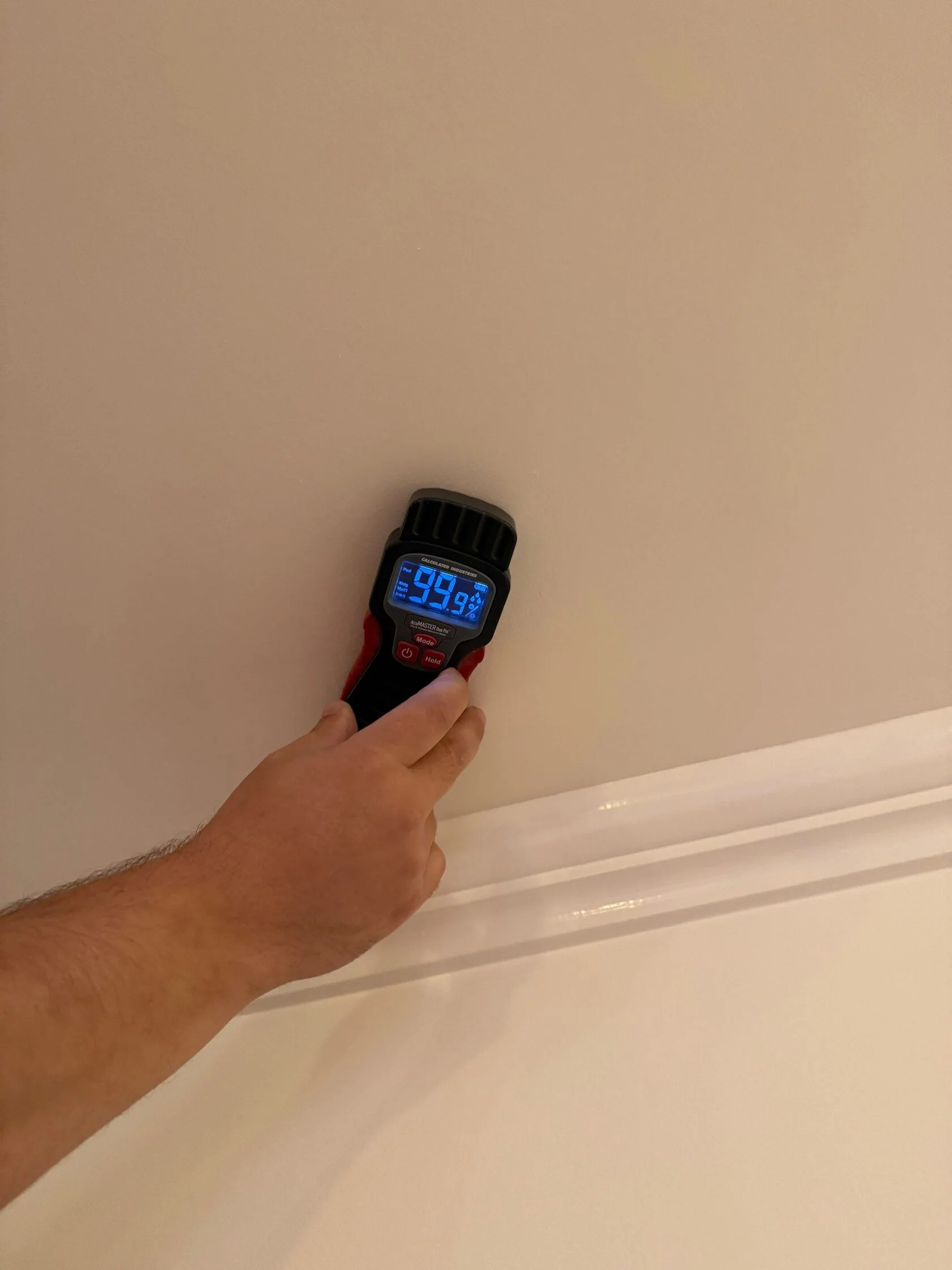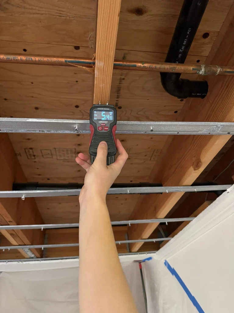 • Elevated moisture levels in ceiling joists (25.3% as shown on moisture meter)