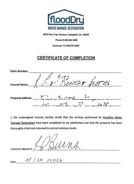 The service performed by FloodDry Water Damage Restoration has been completed successfully, and the property has been thoroughly dried and returned to normal moisture levels